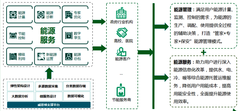 智慧能源管理及服務雲平台,以“互聯網+能源管理”爲發展方向,基於物聯網、大數據、雲存儲等技術,滿足用戶能源計量自動化、能源監控運維等需求,構建面向高校、企業、公共機構、節能服務商及政府節能主管部門的能源管理雲服務中心,與企業生産制造、工藝流程相關的能耗數據緊密結合,實現遠程、智能監測、治理與控制。