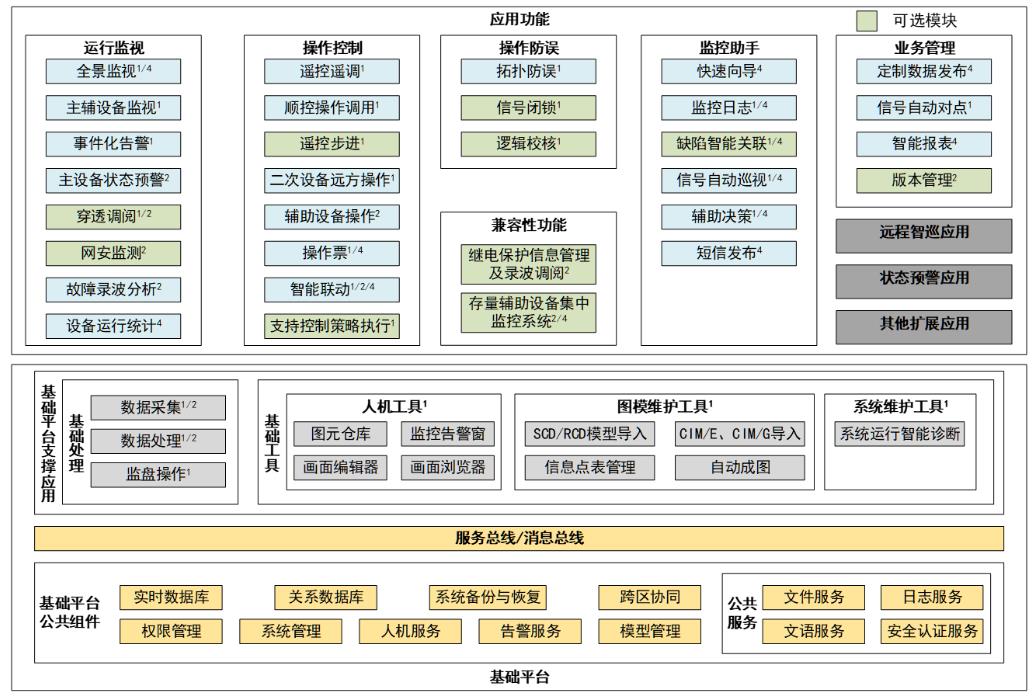 應用功能採(cǎi)取顆粒化、模塊化、服務化設計,總體分爲運行監視、操作控制、監控業務管理、系統維護等四類應用,分布在安全Ⅰ、Ⅱ及Ⅳ區。Ⅰ區主要實現主設備(bèi)監視與控制、輔設備(bèi)重要信息監視、系統維護等應用功能;Ⅱ區主要實現輔助設備(bèi)監視與控制等應用功能;Ⅳ區主要實現監控業務管理、在線智能巡視等應用功能。軟件架構如下(1:安全Ⅰ區,2:安全Ⅱ區,4:安全Ⅳ區):