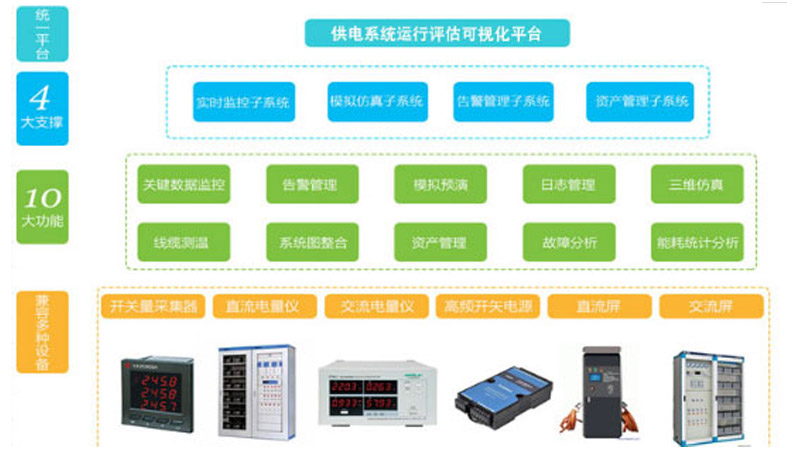 供電(diàn)系統運行評(píng)估可視化平台以電力公司機房供電系統爲監控對象,以供電系統線路拓撲爲基礎。通過專門的傳感器對線路負載、開關狀态進行檢測,不僅提供對供電系統實時運行情況的監控,還能夠根據實時數據對系統運行趨勢進行分析,爲供電系統擴容、檢修提供依據。整個系統的監控對象爲各種供電電源系統,包含高頻開關電源、直流配電屏、交流屏及蓄電池的電壓、電流、開關狀态等;以故障信息爲主要管理對象,包含故障通知、故障處理分析、故障報表等。系統還提供模拟分析功能,通過錄入線路、空開、整流器屬性,可以方便在增加負載設備前,在要增加負載的線路上進行模拟,以防止過載引起事故。同時還可以在檢修前對電源檢修會引起的斷電範圍進行模拟,根據模拟情況制定相應預案,減少檢修事故損失,從而大大提高供電系統運維效率。